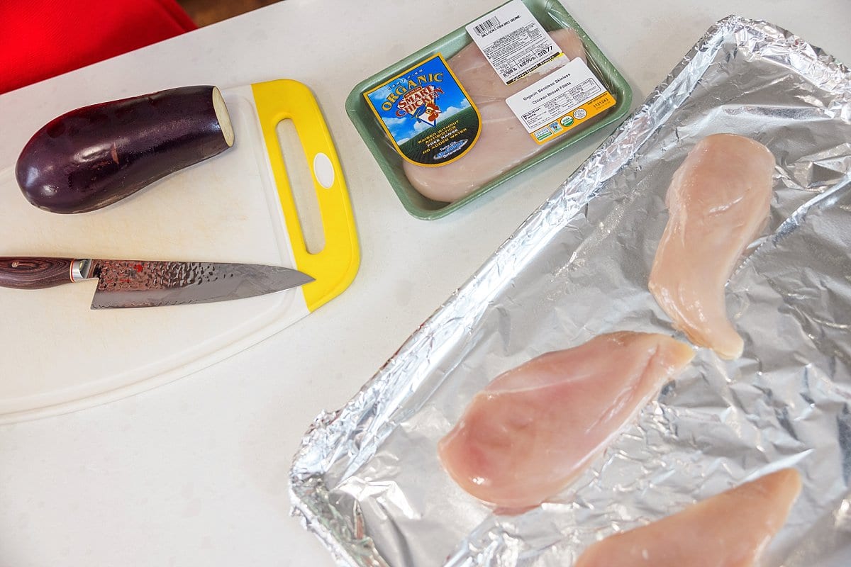 Next, chop up your produce. When cutting large, round produce like Eggplant, I’ll either cut it in half or cut off the edges first so that it can lay flat for easy cutting. Chop your eggplant into bite sized chunks, and sprinkle it around the chicken on the pan.
