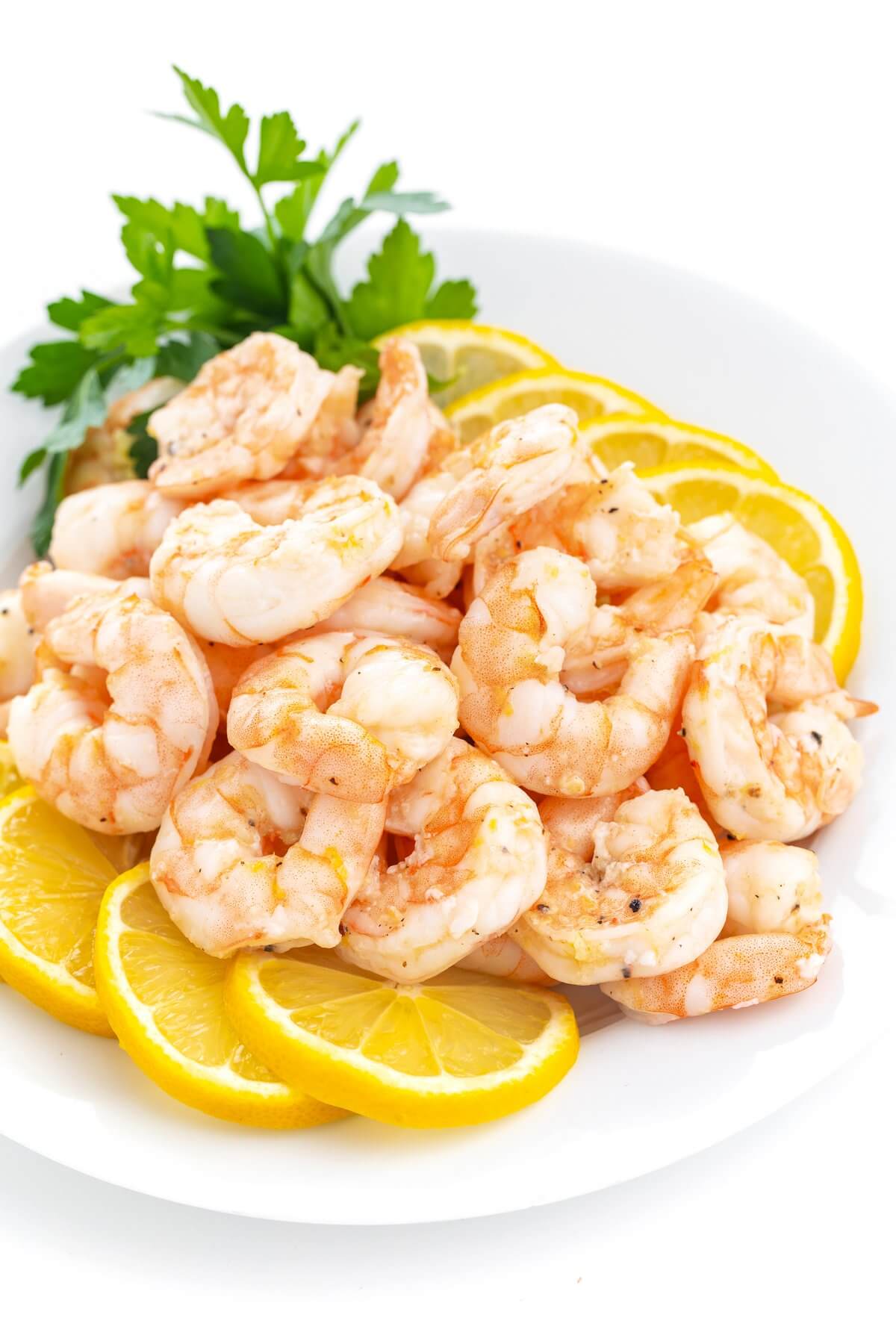 Shrimp is tossed with olive oil, lemon and garlic then roasted in a sheet pan until firm and bright pink. Ready in 15-minutes!