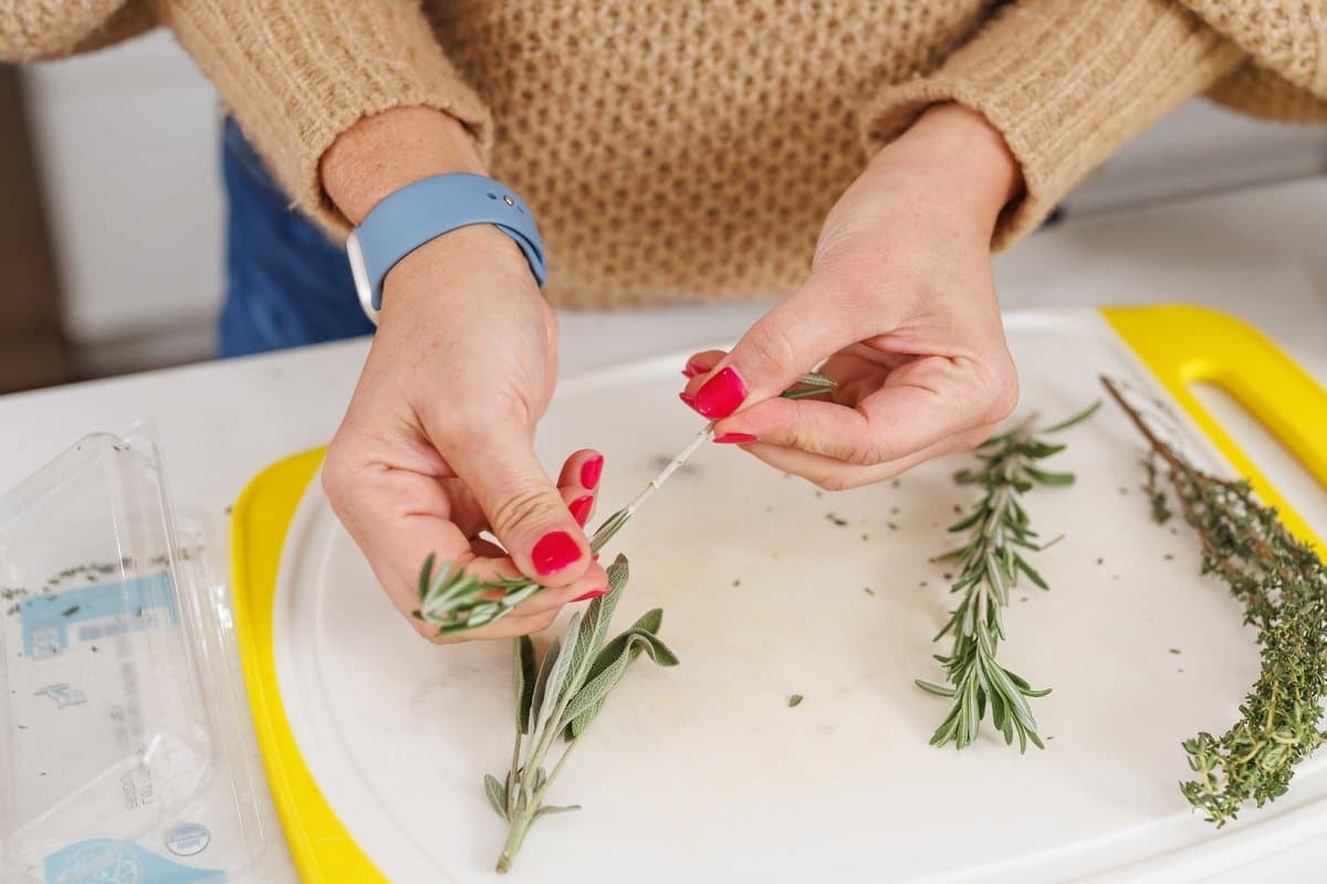 Start your sheet pan pork chops by preparing your fresh herbs. I used sage, rosemary, thyme, and garlic to season my pork. Destem the herbs and finely mince them.