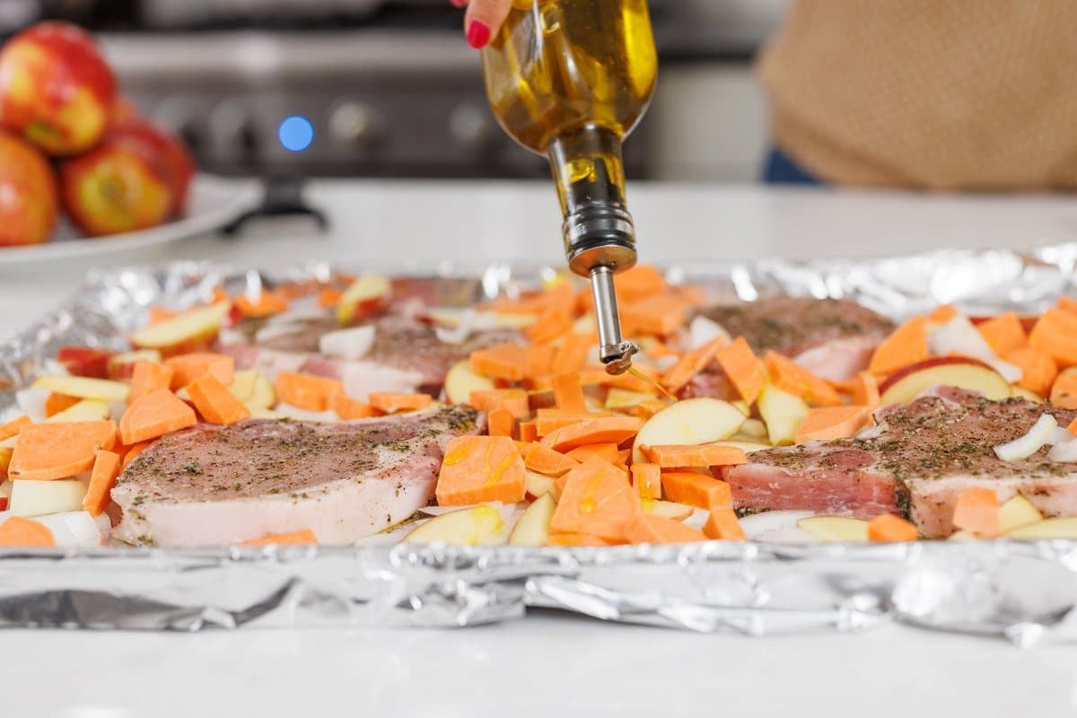 Spread your chopped produce around the pork chops on the sheet pan and drizzle with olive oil.