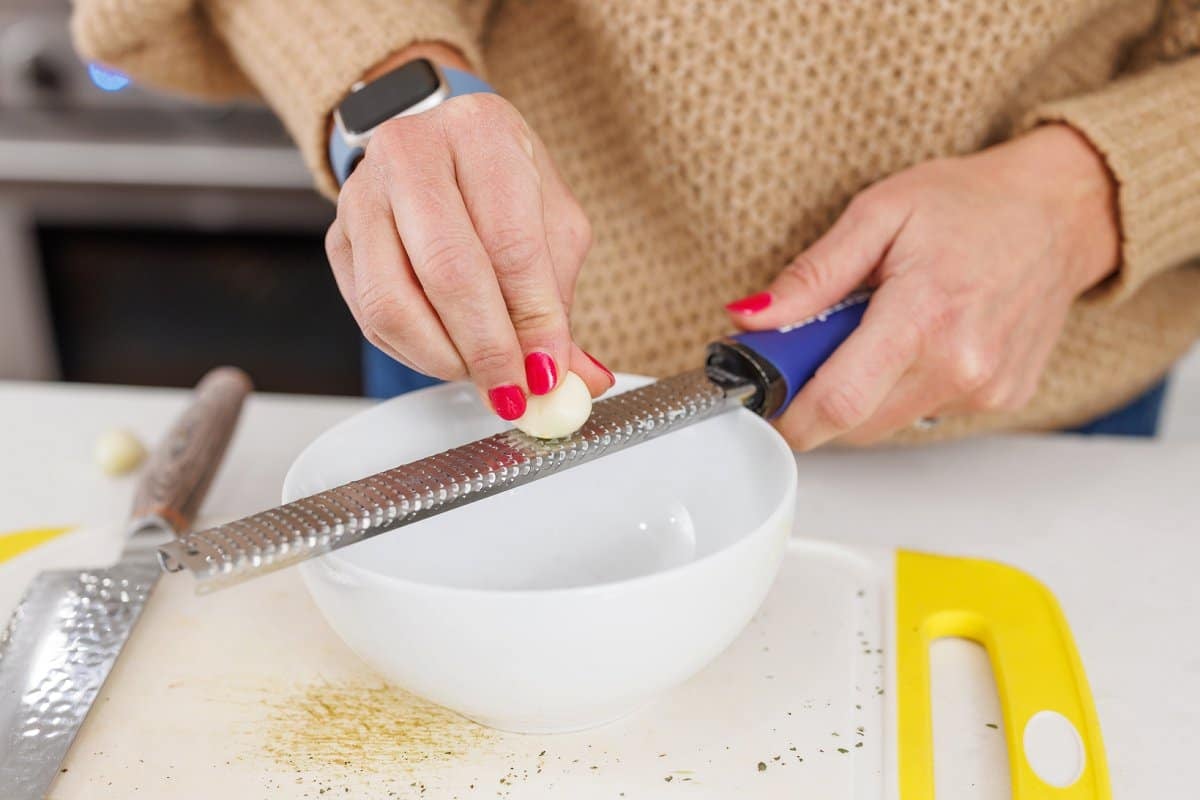 Then in a small bowl, grate some garlic with a microplane.