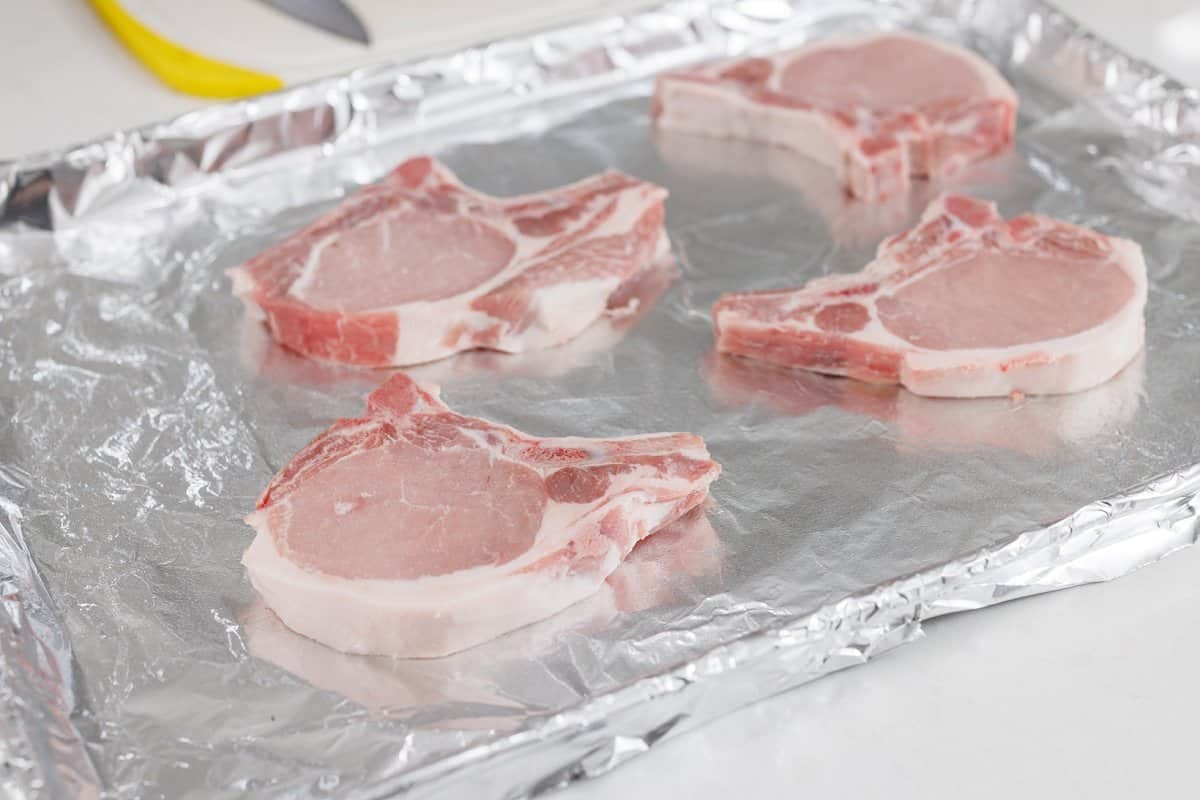 Then on a prepared baking sheet, lay out your pork chops.