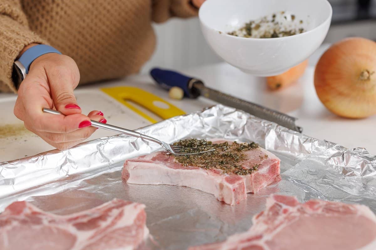 2. Mix together half the olive oil (two tablespoons) with the fresh herbs, garlic, salt and pepper then rub pork chops evenly to coat on both sides. Place in single layer on baking sheet.