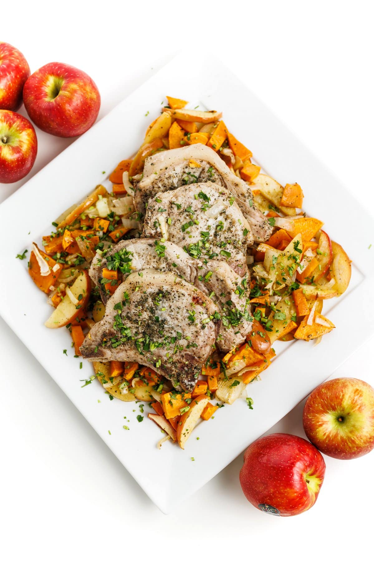 The ultimate no-mess sheet pan dinner recipe, pork chops are rubbed with olive oil and herbs then roasted with apples, onions and sweet potatoes. You won’t believe how delicious or easy this one pan pork recipe is to make!