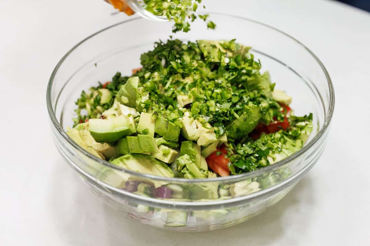 1. Pat the shrimp dry and mince into small pieces. Place in a large bowl and toss with lime juice.  Refrigerate for 2-3 hours.