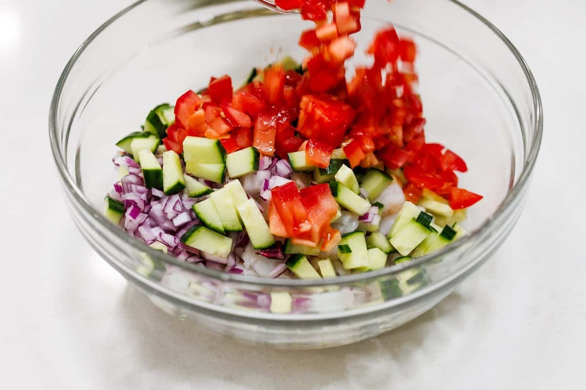 Then in a large bowl, add the shrimp, onion, cucumber, and tomatoes.