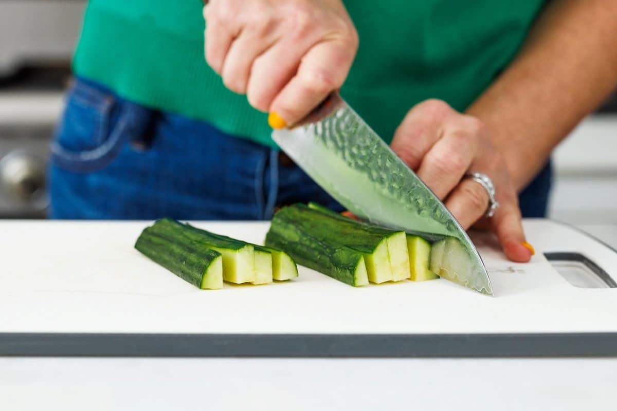 2. Meanwhile, stir together cilantro, onion, tomato, cucumber, and serrano chilis in a medium bowl. Once the shrimp has marinated, remove any excess moisture that has accumulated into a small bowl. Reserve in case you need to add liquid at the end.