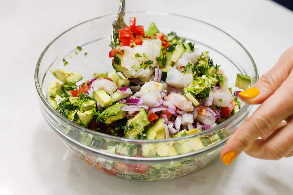 Gently stir until evenly mixed and coated in the lime juice. Refrigerate until shrimp is fully pink, letting the lime juice “cook” away any harmful bacteria.