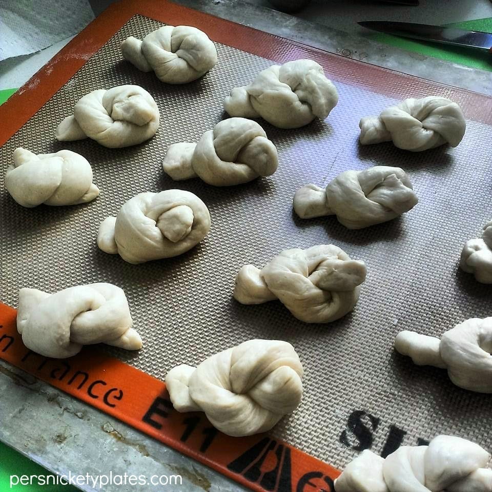 - Cut the dough into 16 strips. Roll each strip into a rope, then tie each rope into a knot. Place each knot onto the prepared baking sheet, about 1″ apart. Repeat until out of dough.