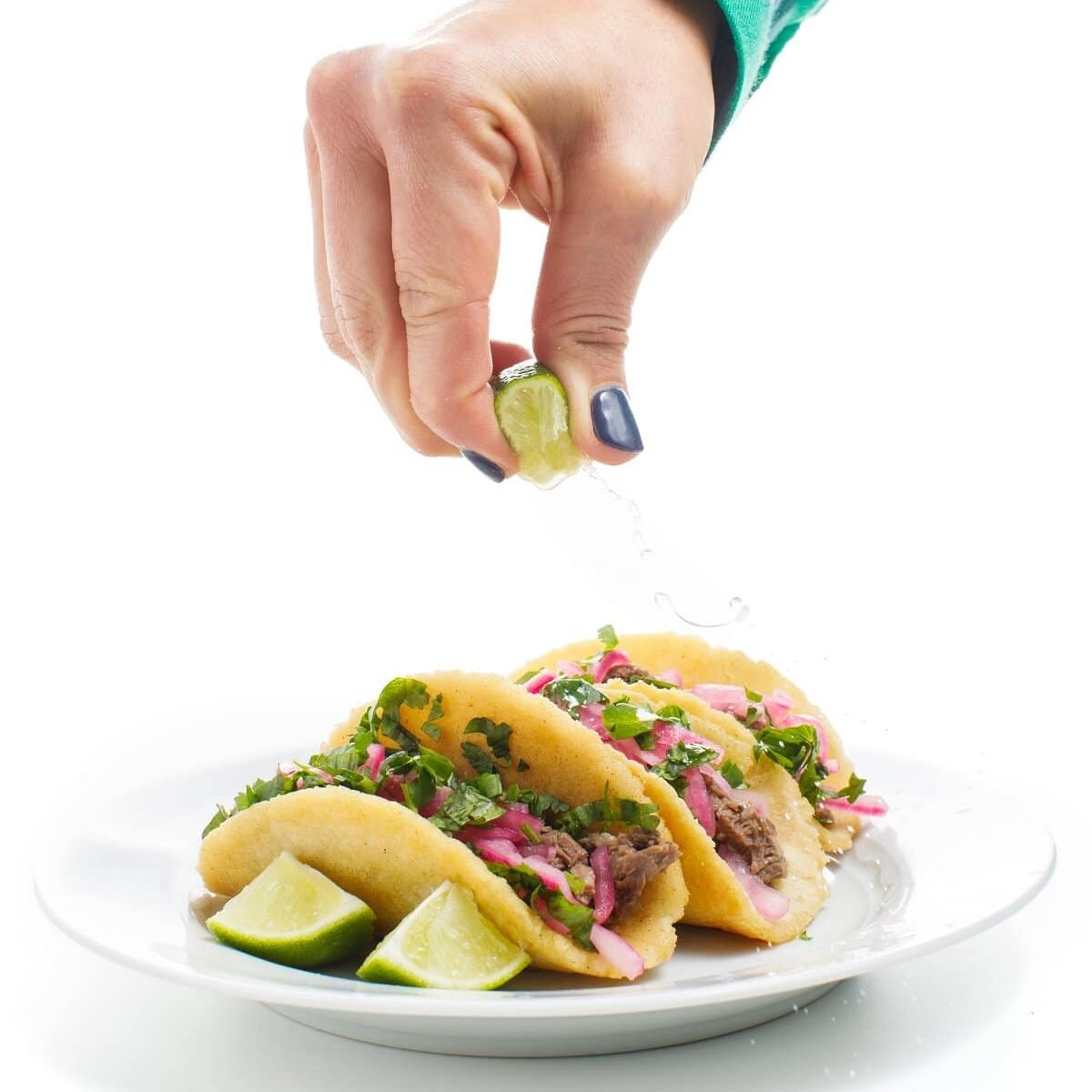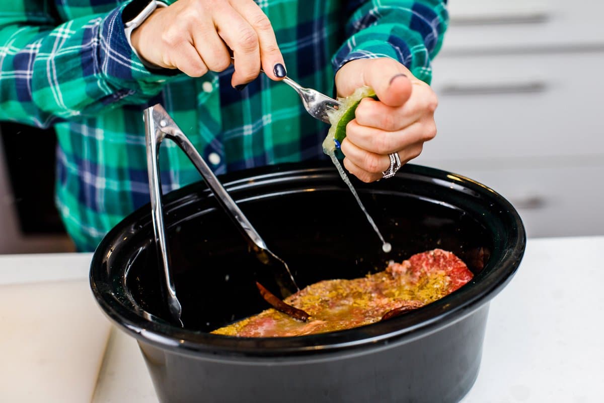 3. Return shredded beef to slow cooker and sprinkle with lime juice. Serve with corn tortillas, cilantro and minced onion.