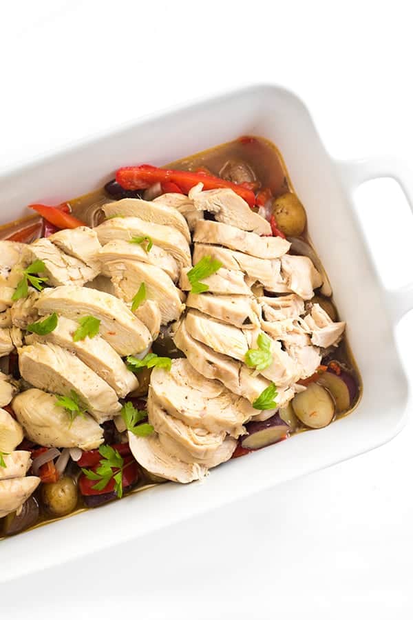 To maximize flavor, the chicken and vegetables are seasoned liberally with salt, pepper, oregano and garlic powder. I also love adding in a splash of red or white wine if I have some laying around but it’s optional.