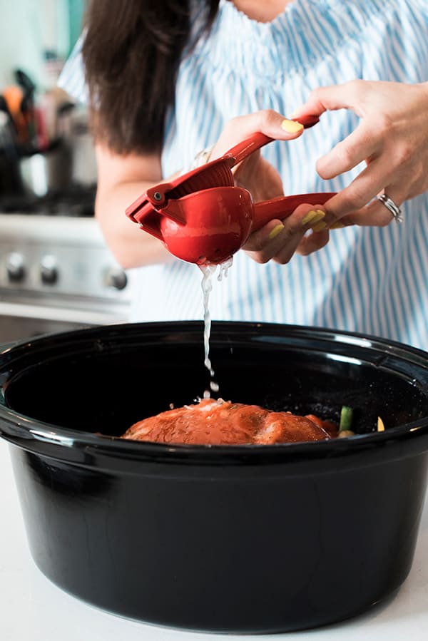 3. Add beef broth, crushed tomatoes and lime juice to the slow cooker and cover with lid. Heat on Low for 8 hours or High for 4 hours. Shred with a fork before serving with rice, in tortillas or on a salad.