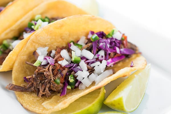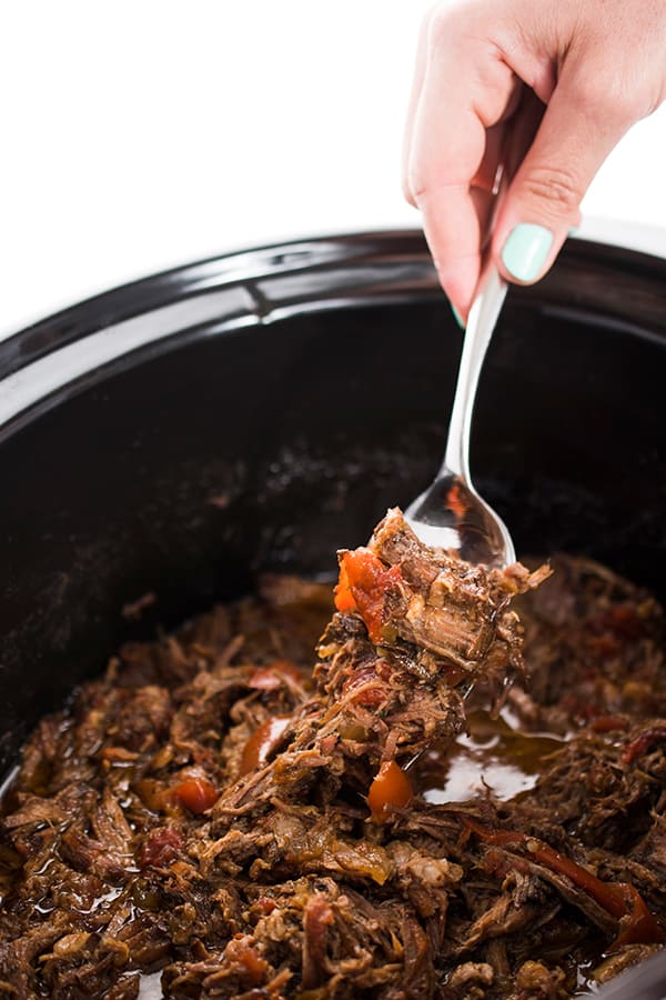 Beef is simmered with peppers, tomatoes, lime juice, cumin, garlic and other warm spices like cloves and allspice. When it’s done cooking I love to shred it and serve with warmed corn tortillas.