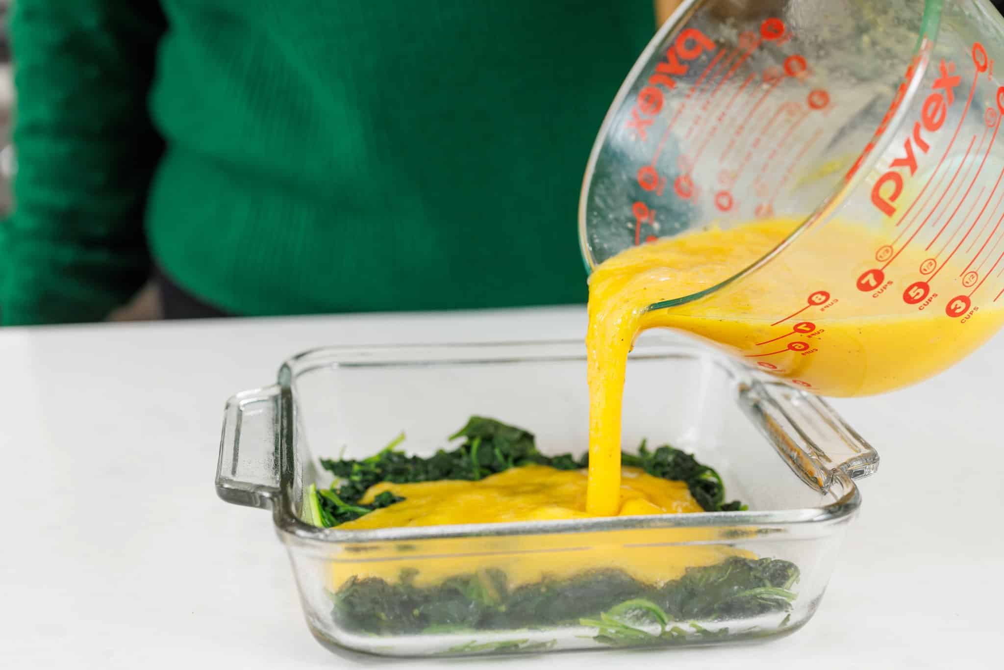 Once your eggs are all beaten, pour the mixture into the baking dish over the spinach.