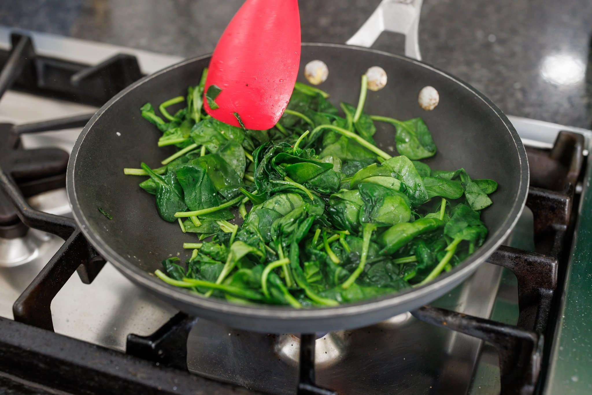 - Heat oil in a large frying pan over medium-high heat. Add spinach and sauté until bright green and wilted, about 4-5 minutes. Spread cooked spinach into an even layer in baking pan.1 teaspoon extra virgin olive oil, 11 ounces baby spinach