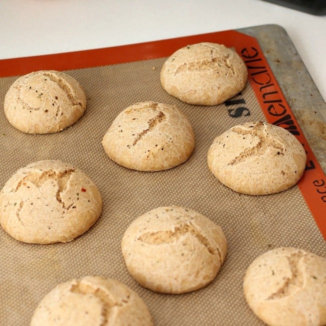 - Form dough into equal sized balls and place on a greased cookie sheet so they are not touching. I made two sheets of 8 rolls. One sheet I cooked immediately, one I froze.