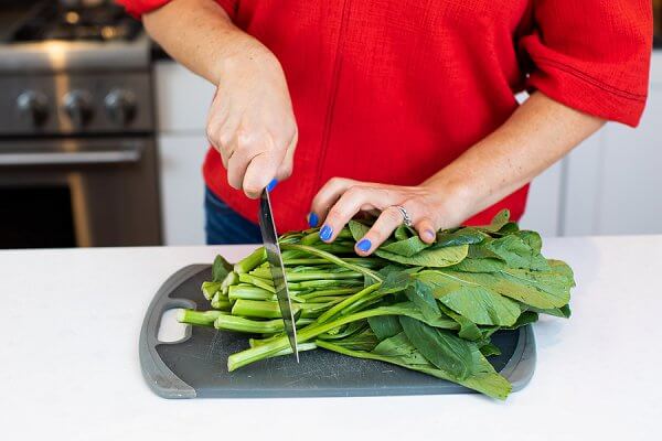 To prepare the Chinese broccoli, simply remove the bottom 1-inch of the steams which can be a bit tough.  The rest can be cut any way you wish – either in thirds, halved or left in long pieces. It typically depends on how thick the Chinese broccoli is.