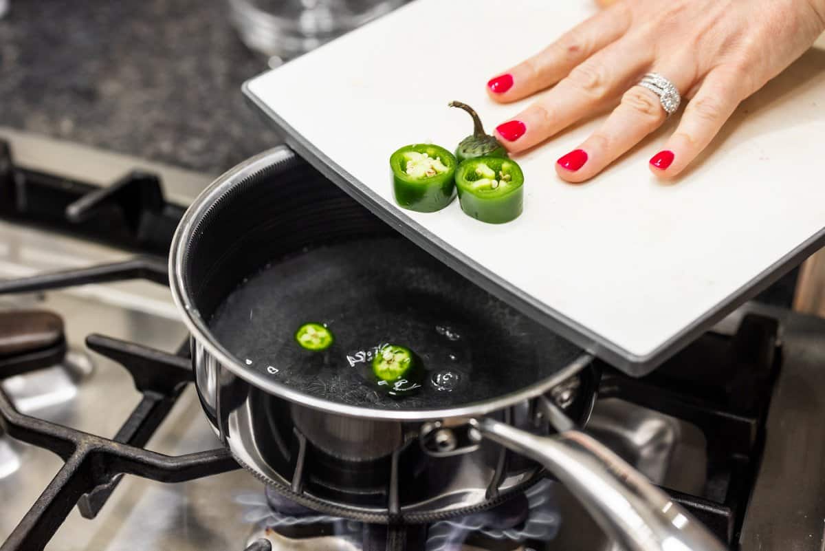 Once the water and sugar are fully combined and the sugar is dissolved, add the sliced jalapeño. Or you could infuse it with fresh ginger or mint!