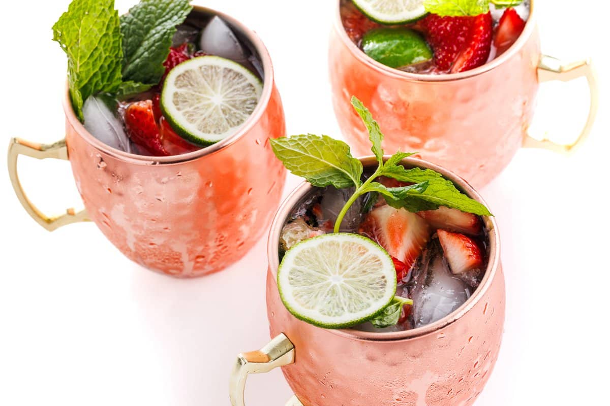 Moscow Mules are one of my favorite cocktails for entertaining. Refreshing and citrusy with a kick of ginger and sweetness, they are always a crowd favorite. Throughout the year I love to change up the traditional Moscow Mule recipe by adding in various seasonal ingredients. If you love a Moscow mule, try my cranberry Moscow mule, pomegranate Moscow mule or a spicy apple cider mule. If you like to experiment with your cocktails like I do, then you’ll love these Strawberry Moscow Mules!