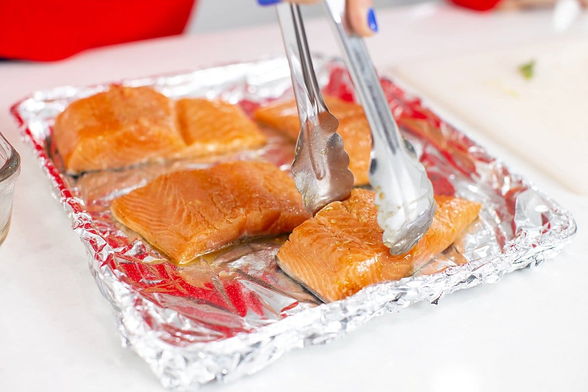 Last, brush or pour the mixture on top of the salmon filets before baking until fork tender.