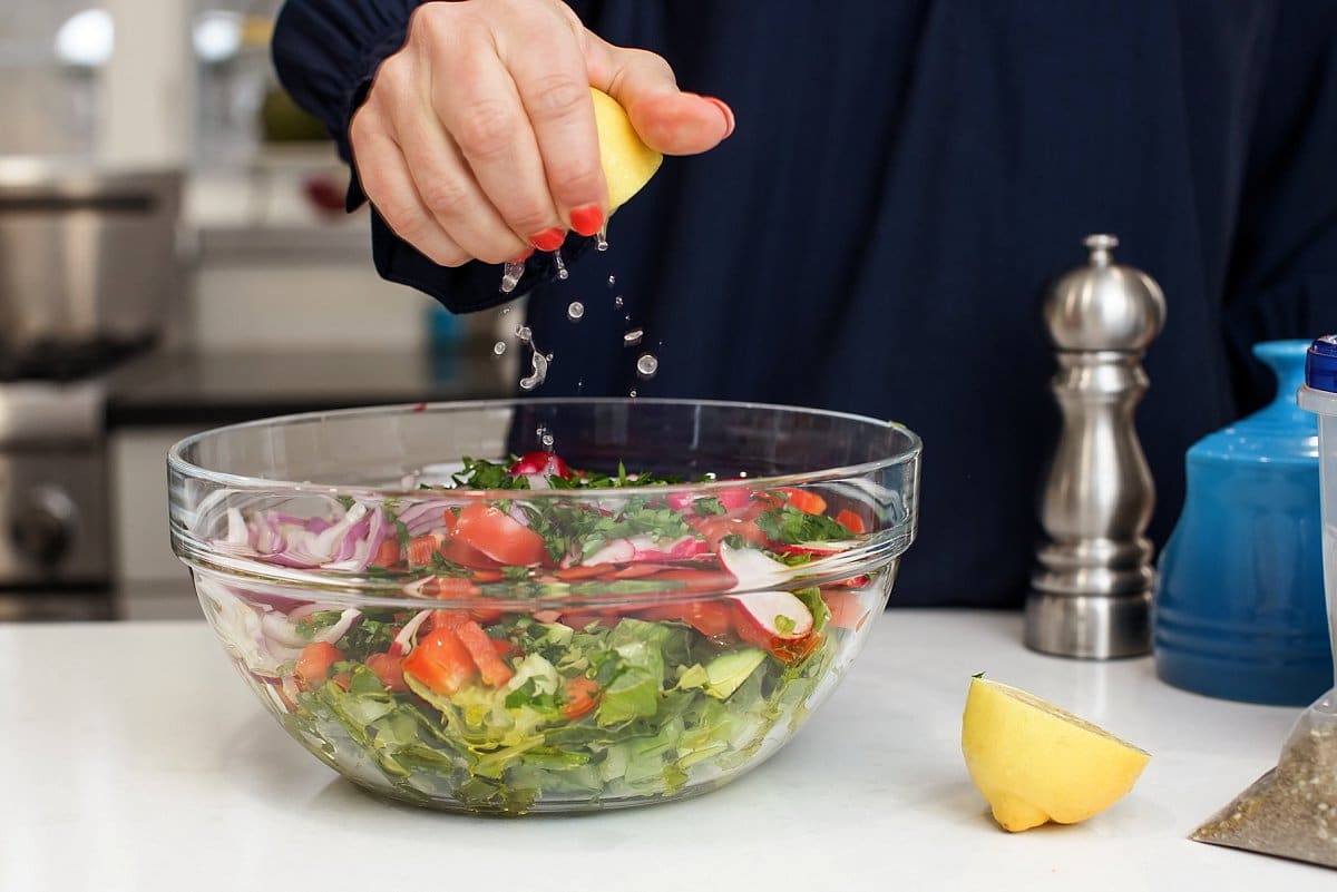 Once ingredients are all in the bowl, take your fresh lemon and squeeze the juice over the top, catching any seeds.