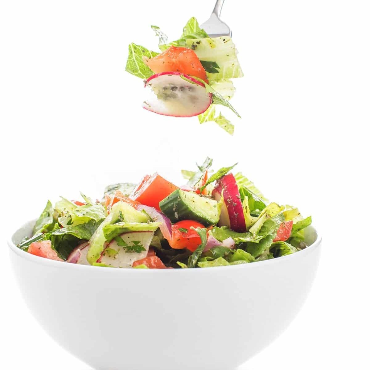 I grew up shadowing my Great Aunt Vieve as she would prepare this delicious, fresh, and addictive Lebanese salad – often alongside a platter of traditional hummus, Labneh with Olive Oil and Za’atar and a pot of Lebanese hushwee on the stove. It’s also perfectly paired with Lebanese Shish Tawook Chicken for some added protein. Dressing the salad directly on the greens, I sat in awe as she seasoned, tested, and adjusted. No measuring, no teaspoons, just instinct. Of course, I don’t expect everyone to able to use instinct to season things, so I’ve figured out the perfect measurements to make this delicious Middle Eastern Syrian Salad.
