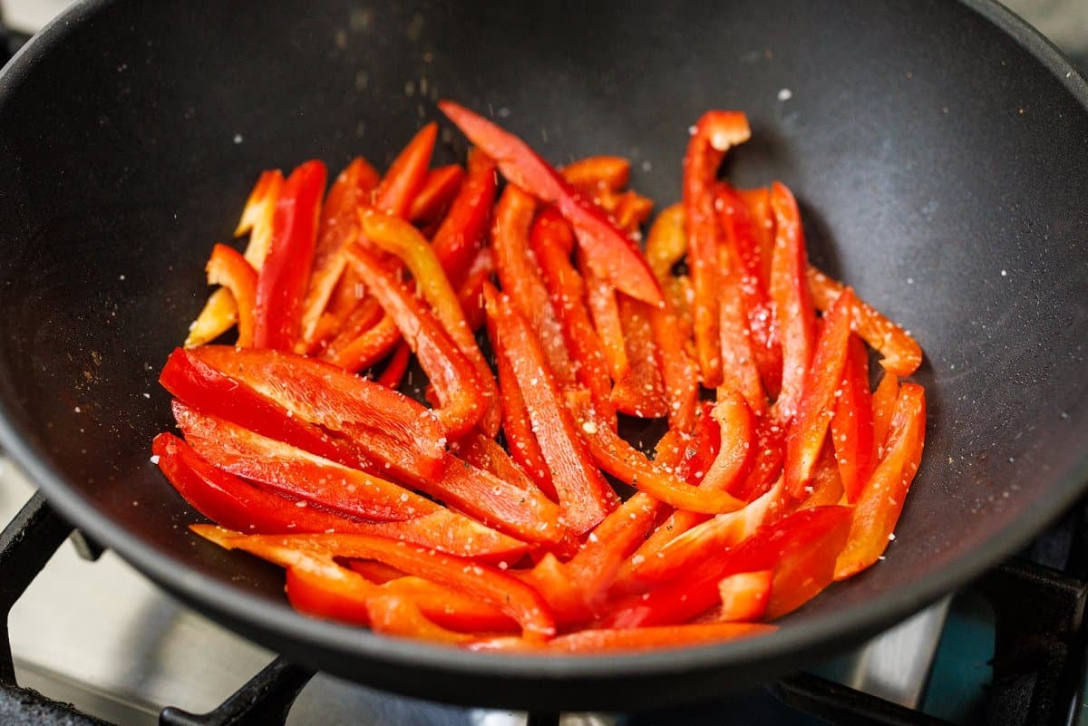 - To the hot wok, at the bell peppers and saute for 3-4 minutes or until they start to soften.