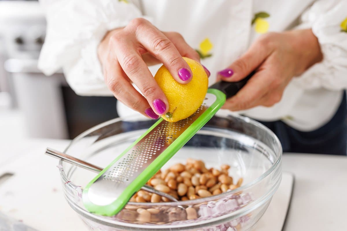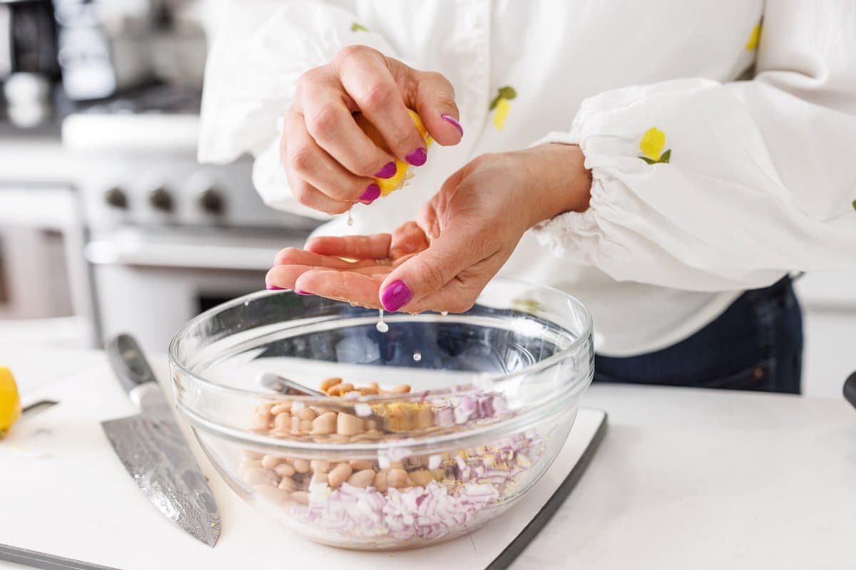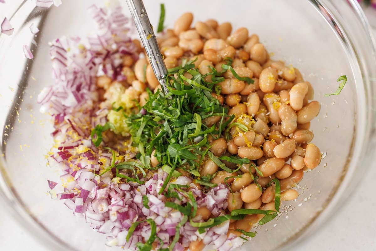 - Add lemon zest, lemon juice, garlic, and olive oil directly over the bean mixture and mix well.