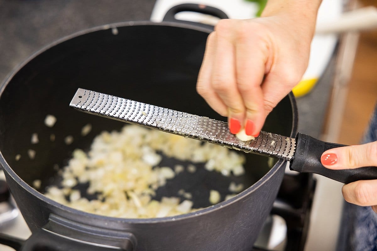 To start your turkey black bean chili, heat a large pot over medium-high heat and spray it with cooking spray. Grate the garlic and add it to the pot along with the onion.
