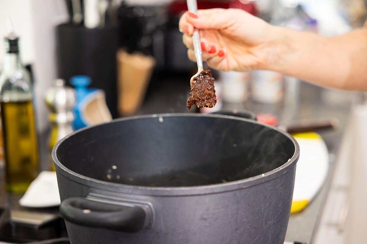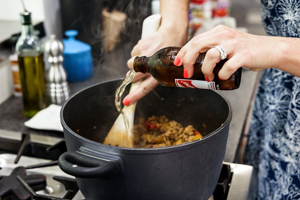 4. Add beer to deglaze, scraping up brown bits on bottom of pan using a wooden spoon.