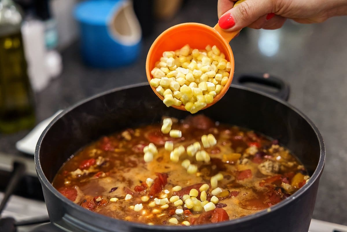 Finally, add in the corn. Bring the chili to a boil, then reduce heat and simmer for about 30-40 minutes.