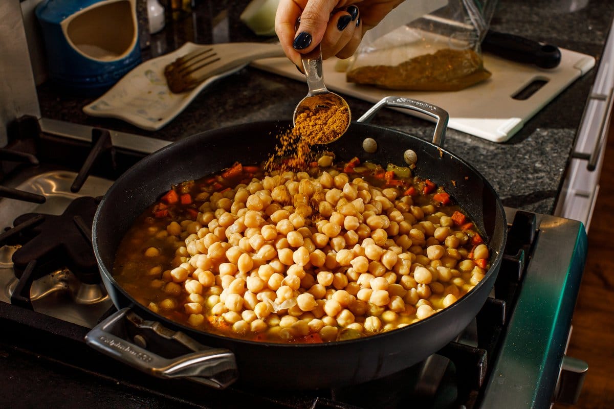 Add the canned chickpeas and vegetable broth, along with the curry powder.