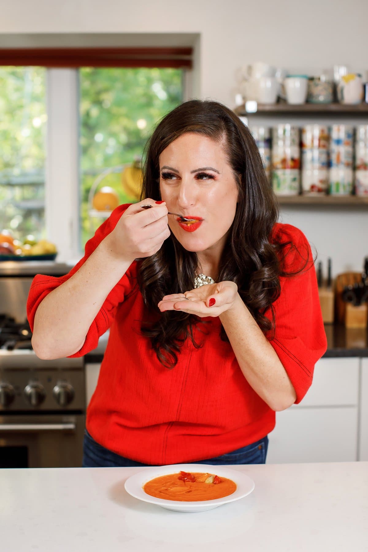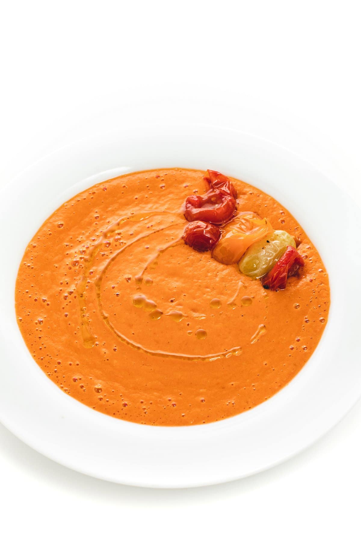 To serve, I love to top the bowl with a few leftover roasted whole tomatoes plus a drizzle of extra virgin olive oil. Toasted pumpkin seeds or cilantro would be a great garnish as well!