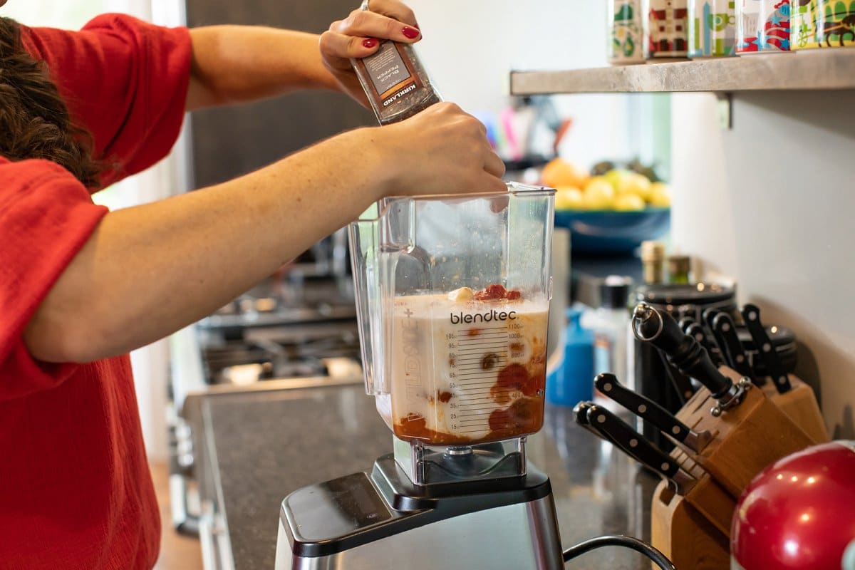 Once you’ve roasted the tomatoes, simply place them in a high speed blender (this is the blender I love to use!)