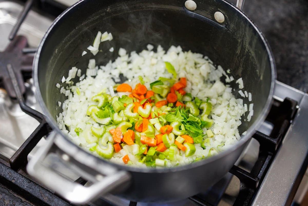 - In a large soup pot, heat olive oil over medium high heat. Add onions and stir until they begin to soften, about 4-5 minutes, before adding in carrots and celery. Season with salt and pepper to taste. Saute until tender, an additional 4-5 minutes, stirring frequently.
