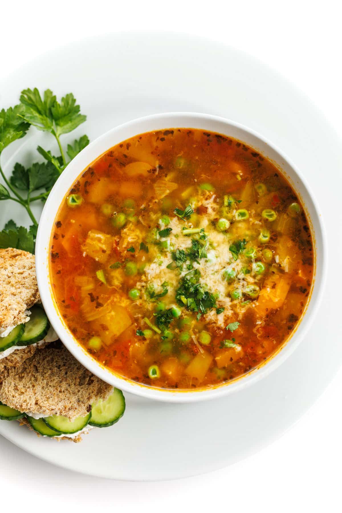 Serve your vegetable soup garnished with parmesan cheese, fresh parsley, and chili flakes and enjoy!