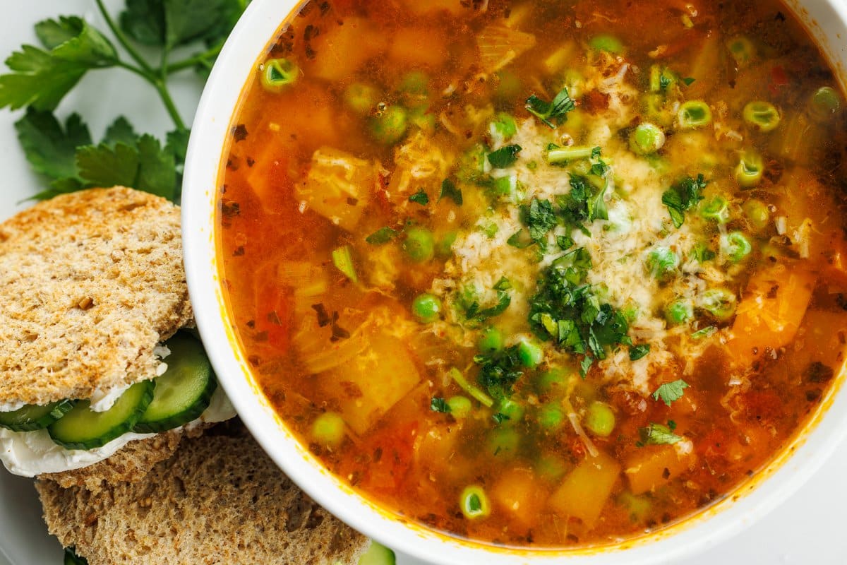 Onions, carrots, and celery are all classics to start with, from there a lot of soups will use potatoes, tomatoes, and peas.