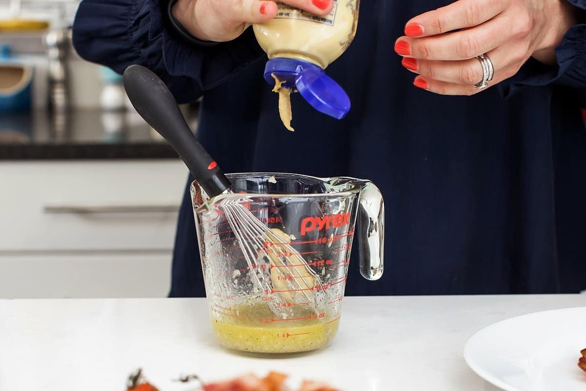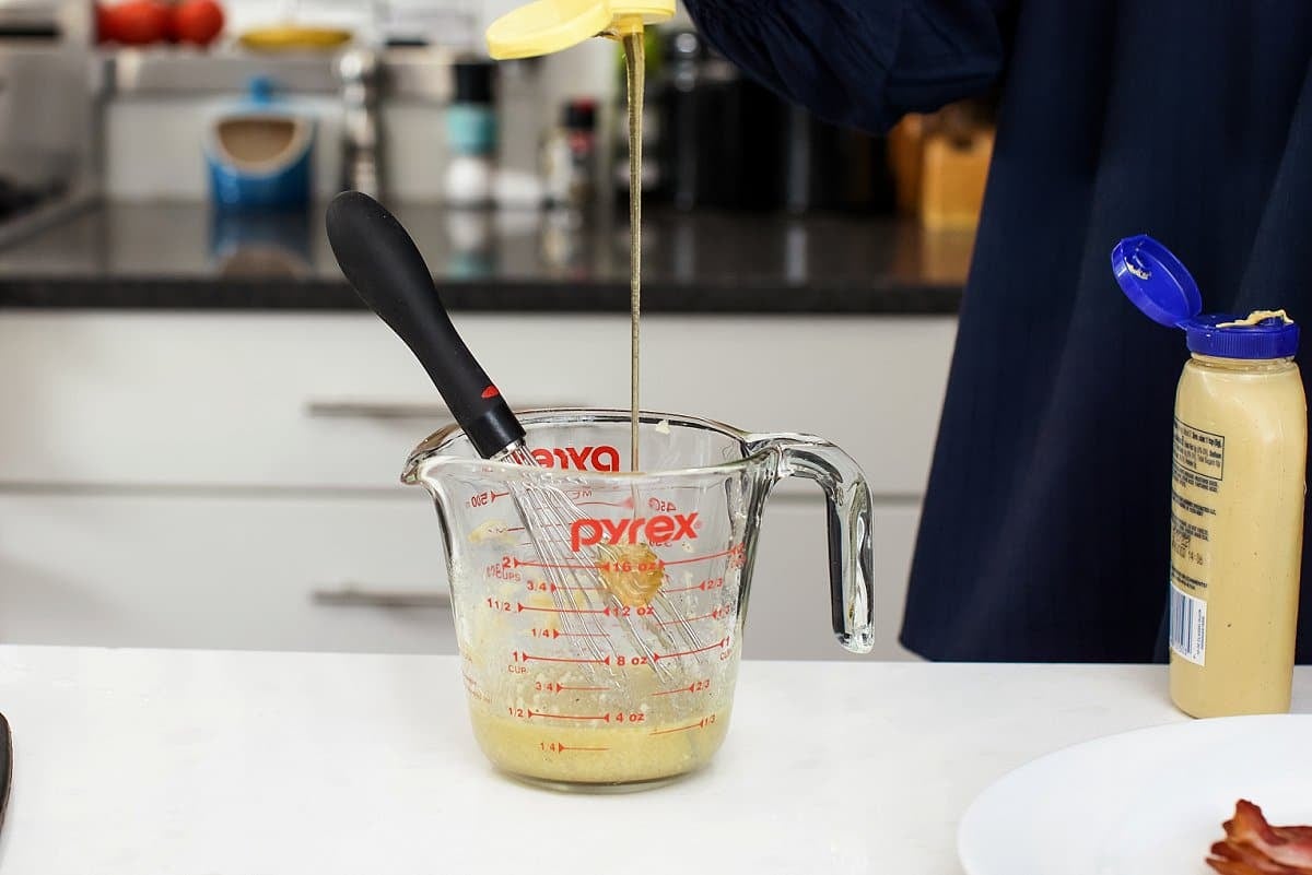 Next add the olive oil and Dijon mustard, whisking frequently to combine.