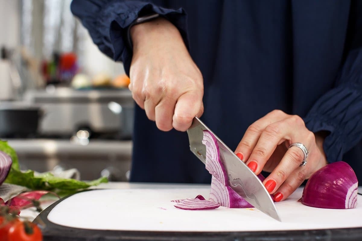 Slice a red onion into thin slices, and cut your cherry tomatoes into halves.