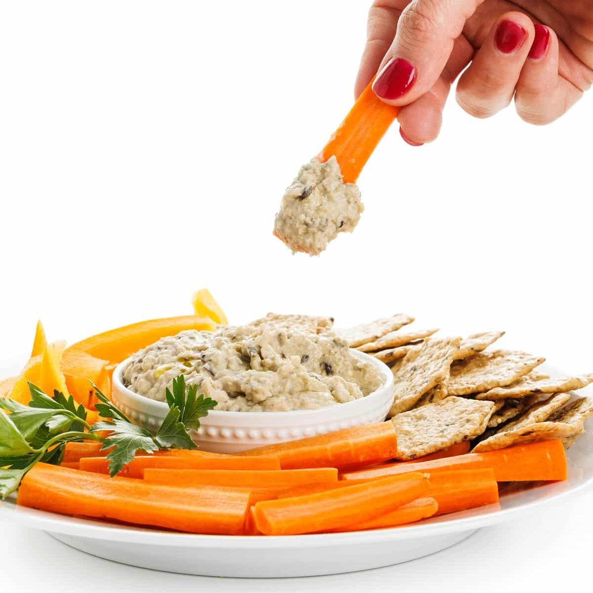 Pita wedges or pita chips, carrots, cucumber slices, crackers, celery. The options are endless, especially because my dip is both gluten-free and vegan!