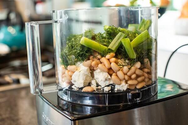 Next, I puree the beans with creamy feta cheese, scallions and fresh herbs. Dill, mint, basil and parsley all work well – just use whatever you have on hand or can get at the store.