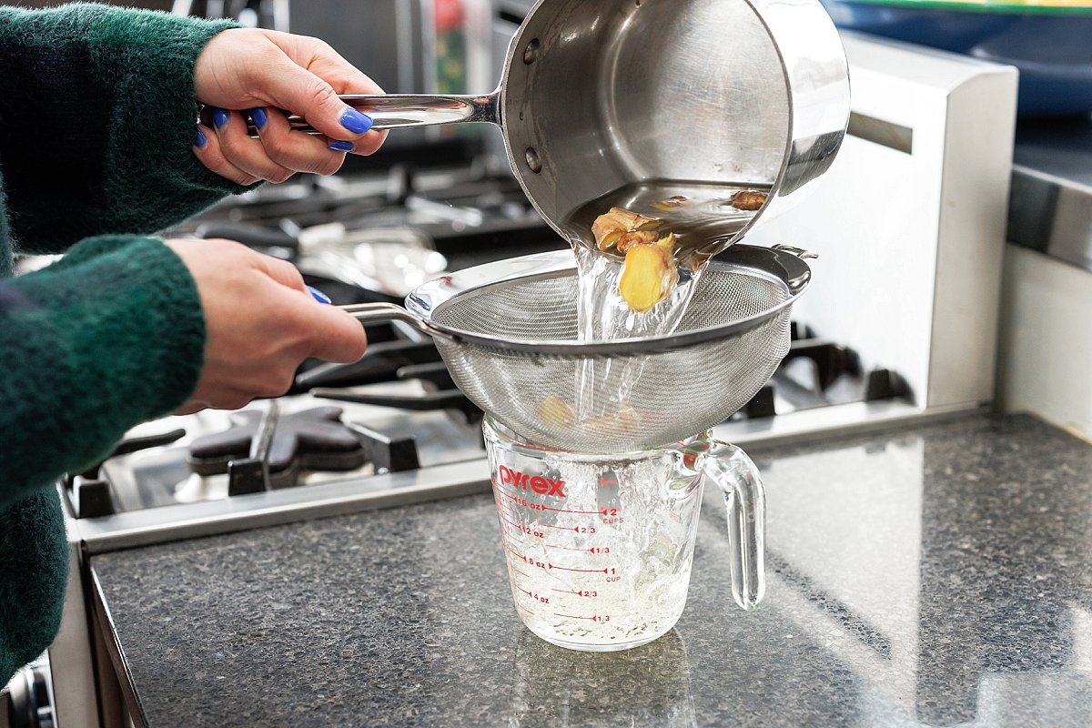 Once cooled to room temperature, strain your simple syrup into a measuring cup or bowl.