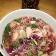 Divide soba evenly into 4 bowls and pour soup on top. Garnish with remaining scallions and serve with lime wedges, Sriracha, onion and cilantro if you wish.