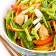 Ditch the takeout menu and make your own Chinese chicken lo mein at home! Made with juicy chicken, crunchy veggies and a fragrant ginger-soy sauce, you will love this 15-minute dinner recipe.
