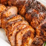 In a long baking dish, mix together all of the spices with a fork until evenly blender. Pat the pork tenderloin dry with paper towel then place in the baking dish. Using your hands, coat the pork tenderloin on all sides evenly with the spice mixture.