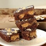 Once done, remove from the oven and immediately sprinkle the chocolate chips evenly over the brownie. Let them melt for about 3 minutes then spread the chocolate over the top. It should spread easily if you let them melt enough. Once spread evenly, sprinkle the crushed peanuts over the top.
