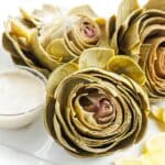 Fresh artichokes are steamed until tender then served with a creamy tahini garlic dipping sauce.