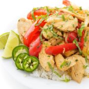 Return chicken to the pan and add soy sauce, lime juice, fish sauce, and sugar. Cook for 2-3 minutes further. Stir in basil right before before serving over Jasmine rice.