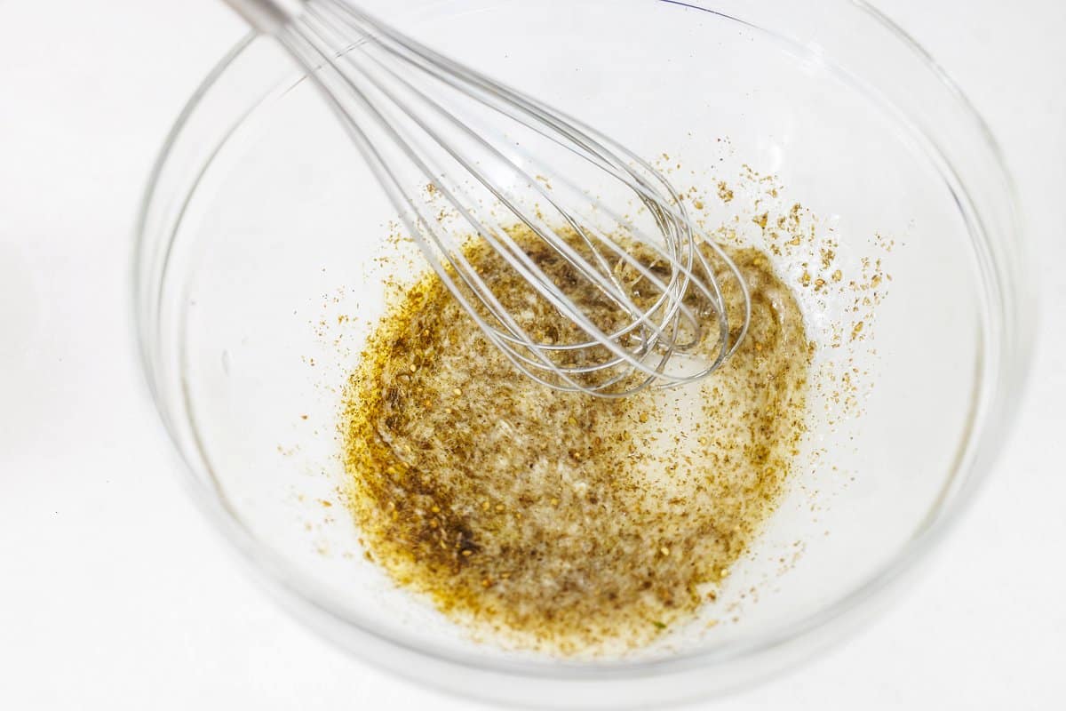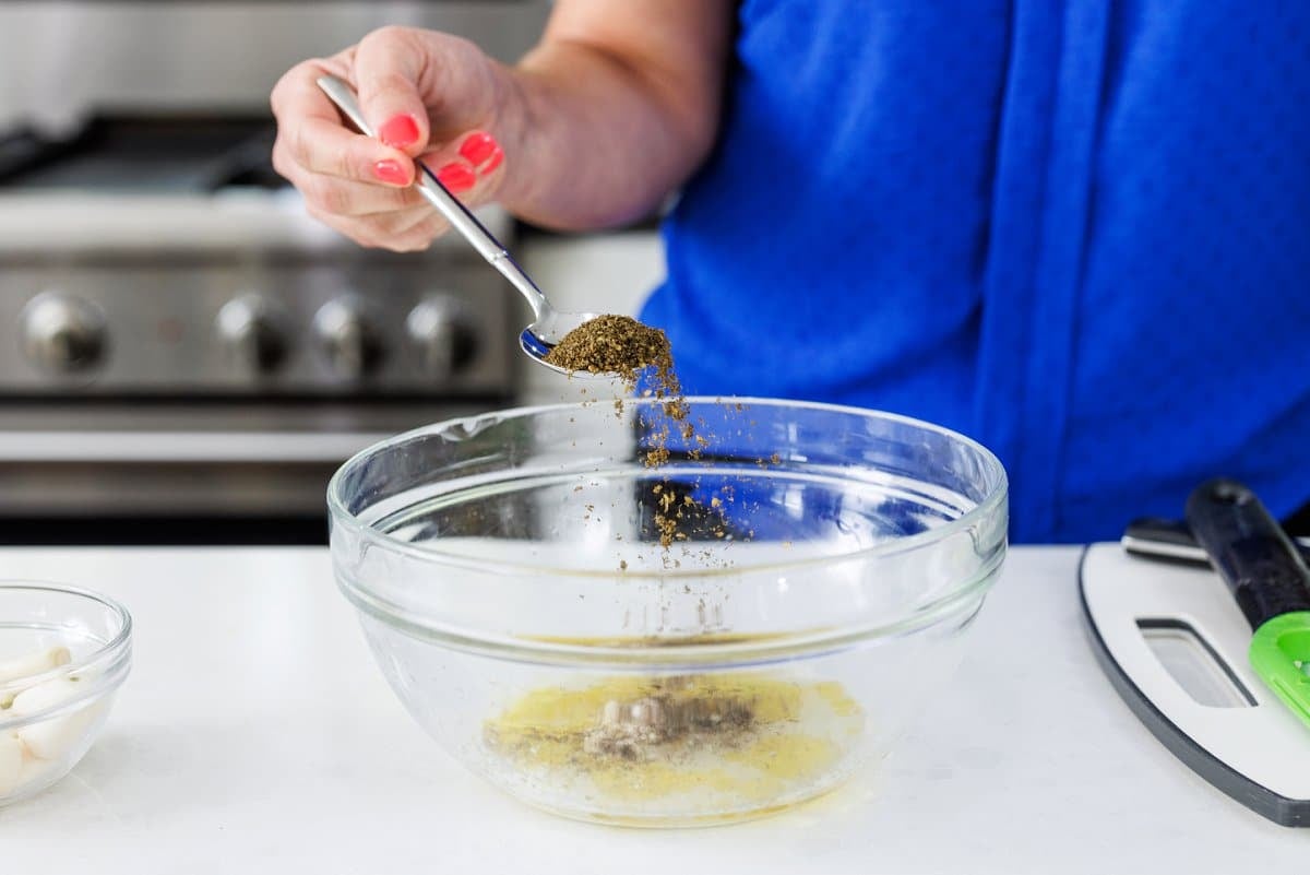 Start your za’atar spiced grilled chicken by making the marinade. First juice your lemon into a large bowl.