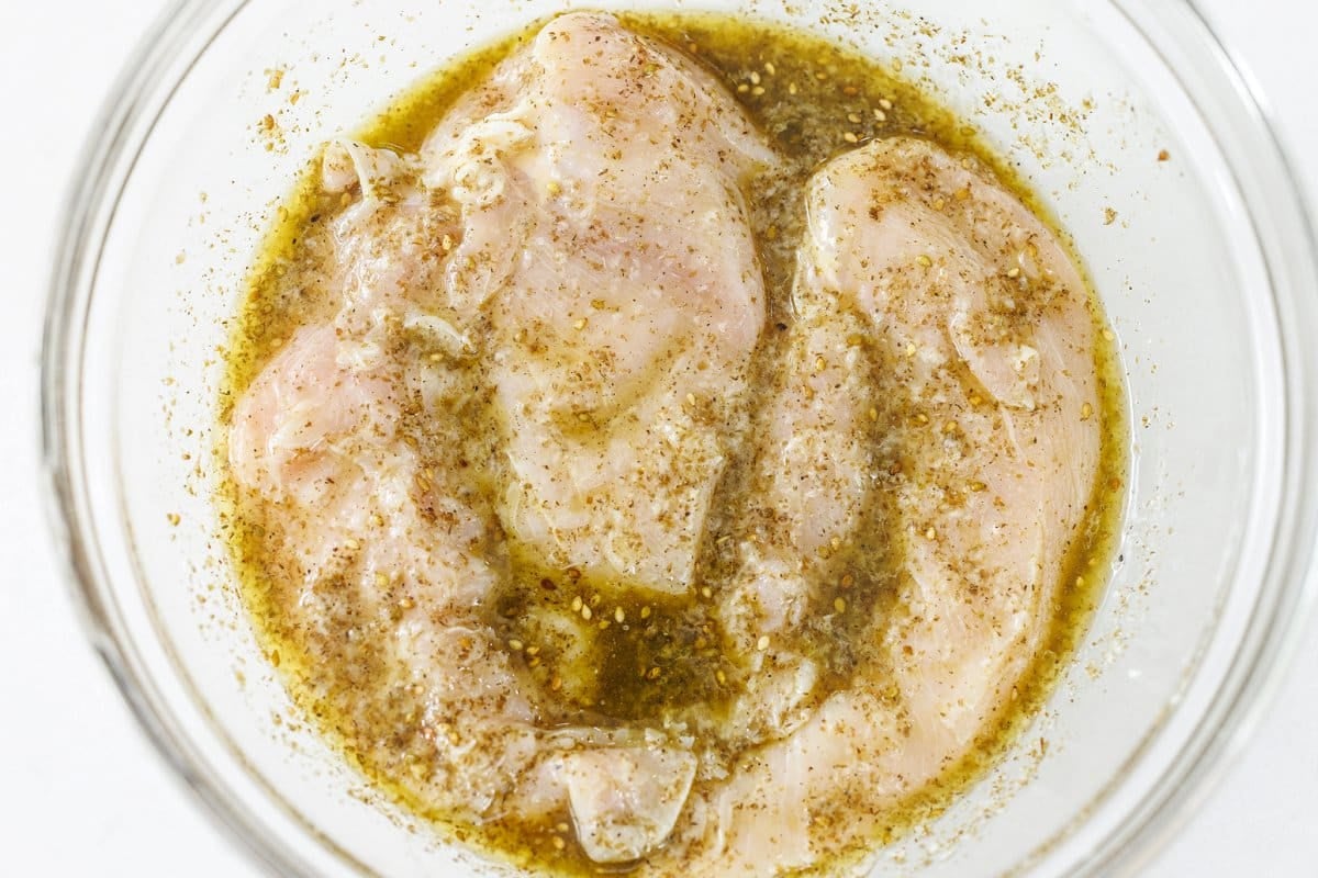 - In a small bowl, whisk together olive oil, lemon juice, za'atar, garlic, salt, and pepper then pour marinade over the chicken. Move chicken breasts around to ensure they are evenly coated in mixture. Refrigerate for 30 minutes or up to overnight.1/4 cup extra virgin olive oil, 1/4 cup lemon juice, 1/4 cup za’atar, 4 cloves garlic, 2 teaspoons salt, 1 teaspoon pepper